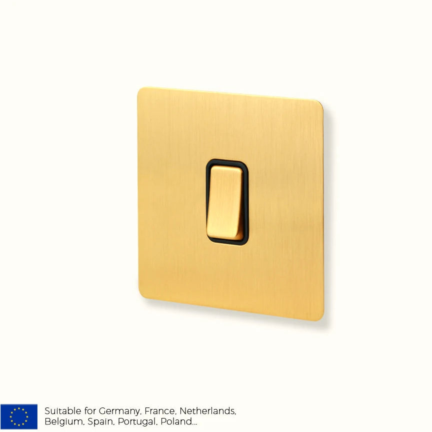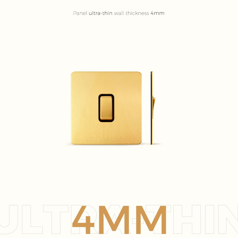 Geef je interieur een luxe, warme uitstraling met ons satin messing schakelmateriaal. Deze hoogwaardige lichtschakelaar combineert een robuust design with premium materialen, perfect voor wie zoekt naar een stijlvolle afwerking in moderne, klassieke of luxe interieurs. Slechts 4mm dik, hierdoor past het materiaal niet in standaard ronde inbouwdozen, bestel dus meteen de juiste inbouwdoos mee. wil je deze look in bestaande ronde inbouwdozen? klik Hier